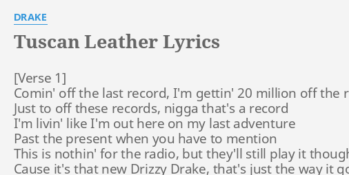 Verse 1 Comin off the last record Im gettin 20 million off the record Just to off these records nigga thats a record Im livin l Lyrics Popular Song Lyrics Billboard Hot 100 Upcoming Lyrics Recently Added Top Lyrics of 2011 Top Lyrics of 2010 Top Lyrics of 2009 More Artists Popular Artists Artists A-Z. Tuscan Leather Lyrics by Drake from the Nothing Was the Same Deluxe Edition Explicit album - including song video artist biography translations and more. Comin off the last record Im gettin 20 million off the record Just to off these records nigga thats a record Im livin like Im out here on my last adventure Past the present when you have to mention This is nothin for the radio but theyll still play it though Cause its that new Drizzy Drake thats just the way it go Heavy airplay all day with no chorus We.
